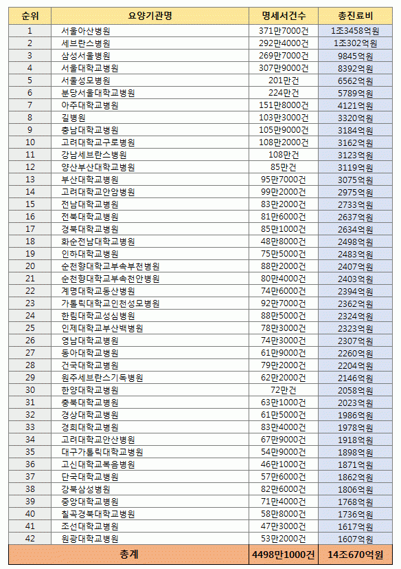 3. 국내 대형병원 진료비 순위