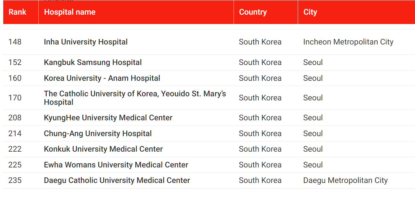 이외에 가톨릭성모병원(104위), 아주대병원(120위), 인하대병원(148위), 강북삼성병원(152위), 고대안암병원(160위), 여의도성모병원(170위), 경희대병원(208위), 중앙대병원(214위), 건국대병원(222위), 이대병원(225위), 대구가톨릭대병원(235위)도 순위 안에 있었습니다.