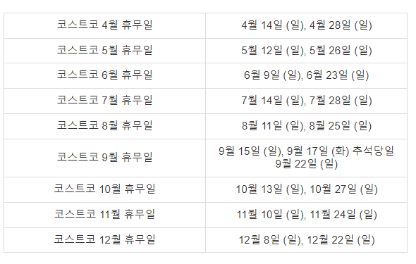 4월과 5월을 포함한 2024년 코스트코 월별 휴무일은 아래 표를 참고해주세요.
