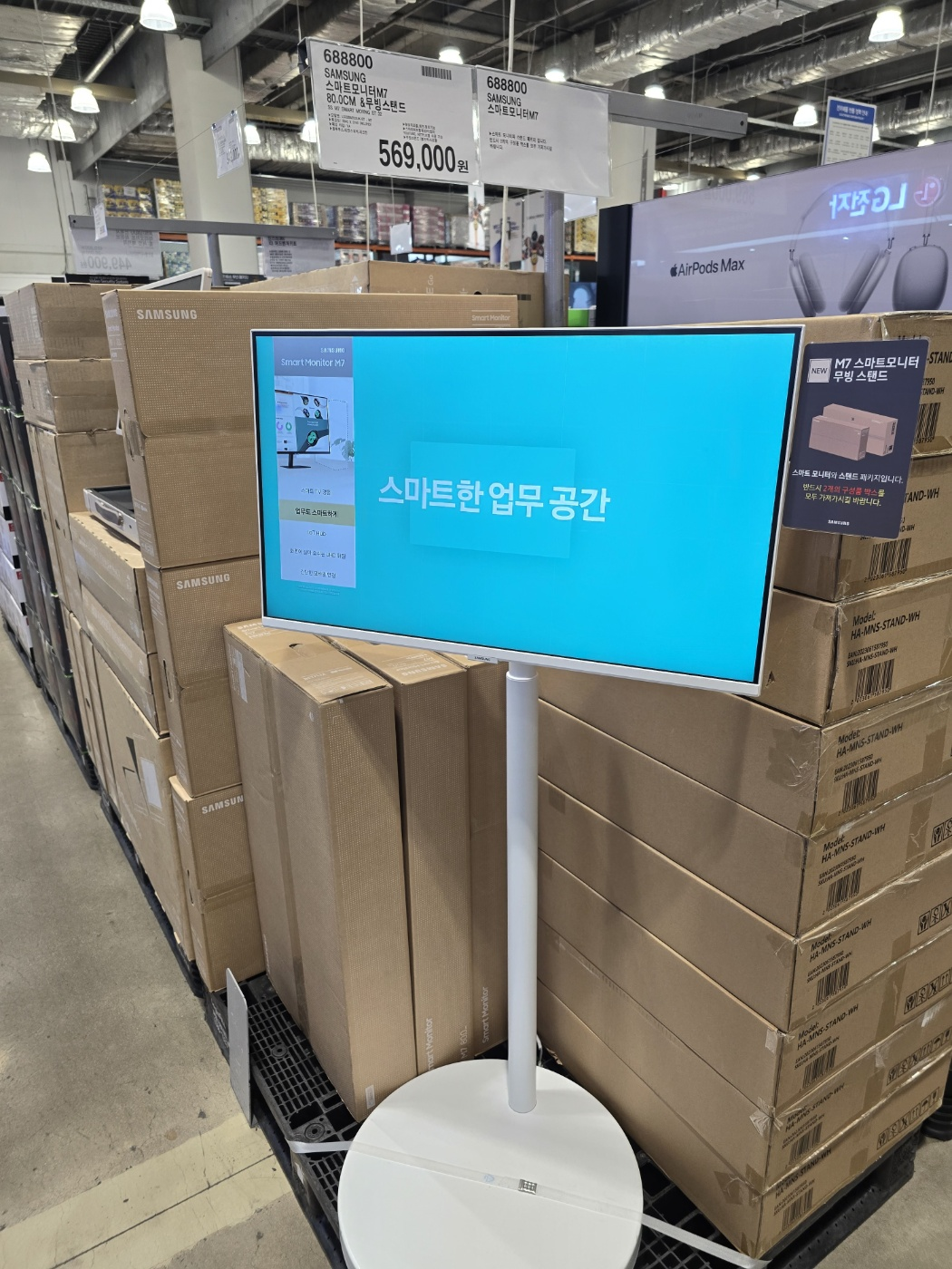 코스트코 추천상품 네 번째는 삼성에서 나온 스마트모니터 M7입니다. 요즘 이런 스탠딩 형식의 모니터와 티비가 유행인 것 같네요. 무빙 스탠드까지 같이 주는데 가격이 꽤 괜찮습니다. 56만원대에 구매 가능합니다.