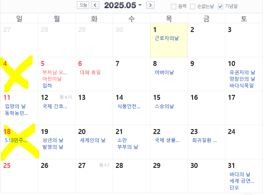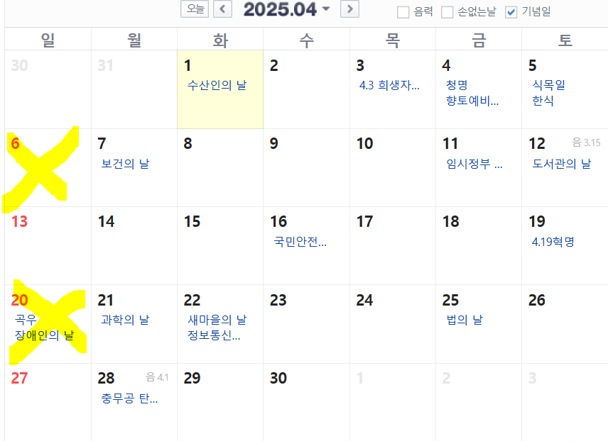아래는 달력에서 보기 쉽게 월별로 휴무일을 표시해봤습니다.