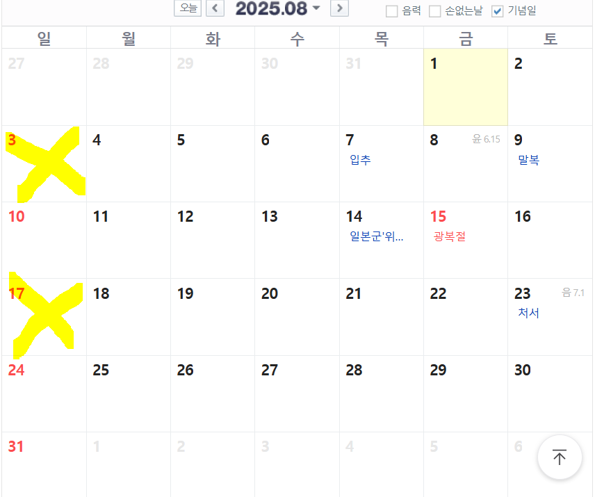 8월 | 3일(첫째주 일요일), 17일(셋째주 일요일) |