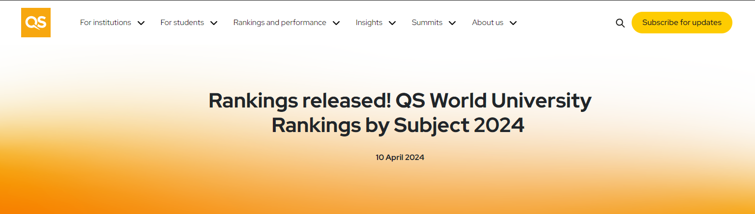 영국의 대학평가기관 QS(Quacquarelli Symonds)는 지난 4월 10일 「2024 QS 학문분야별 대학평가(QS World University Rankings by Subject 2024)」 결과를 발표습니다. 학문분야별 대학평가는 5대 학문분야 및 54개 세부 학과 평가로 이루어져 있습니다.